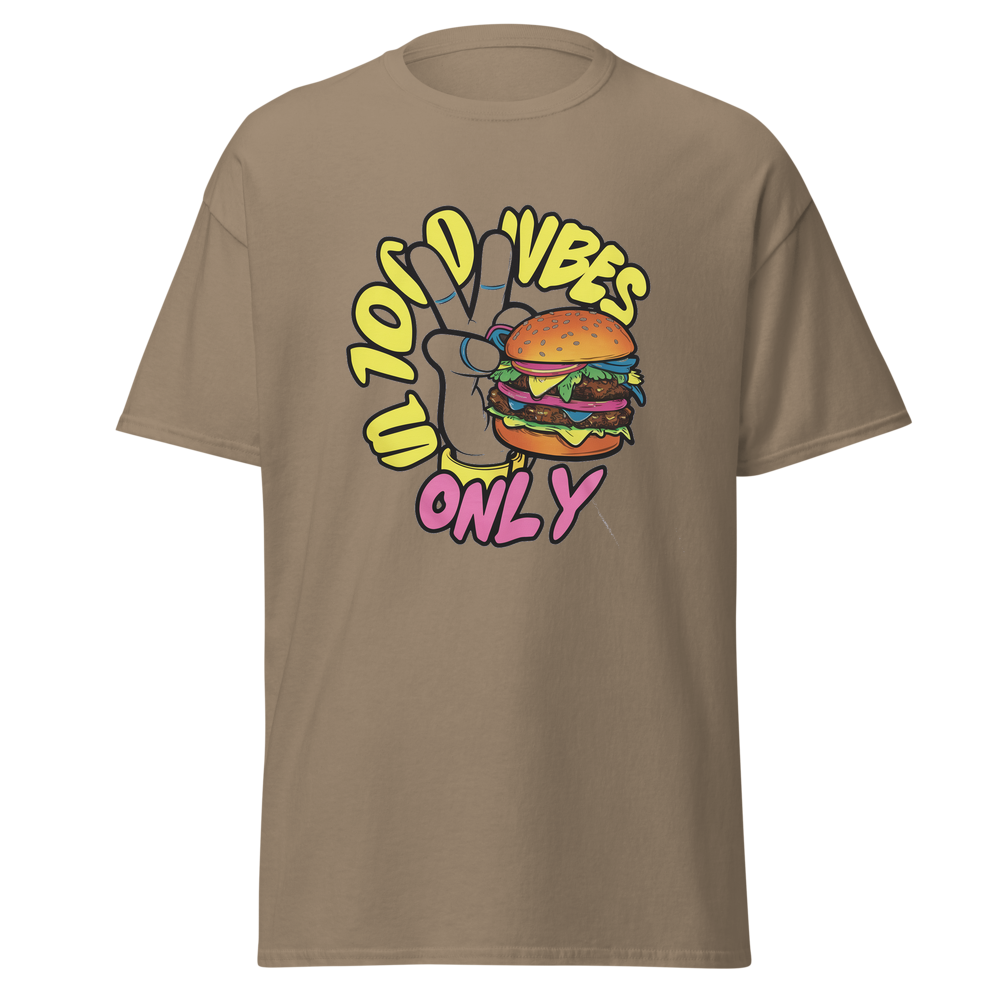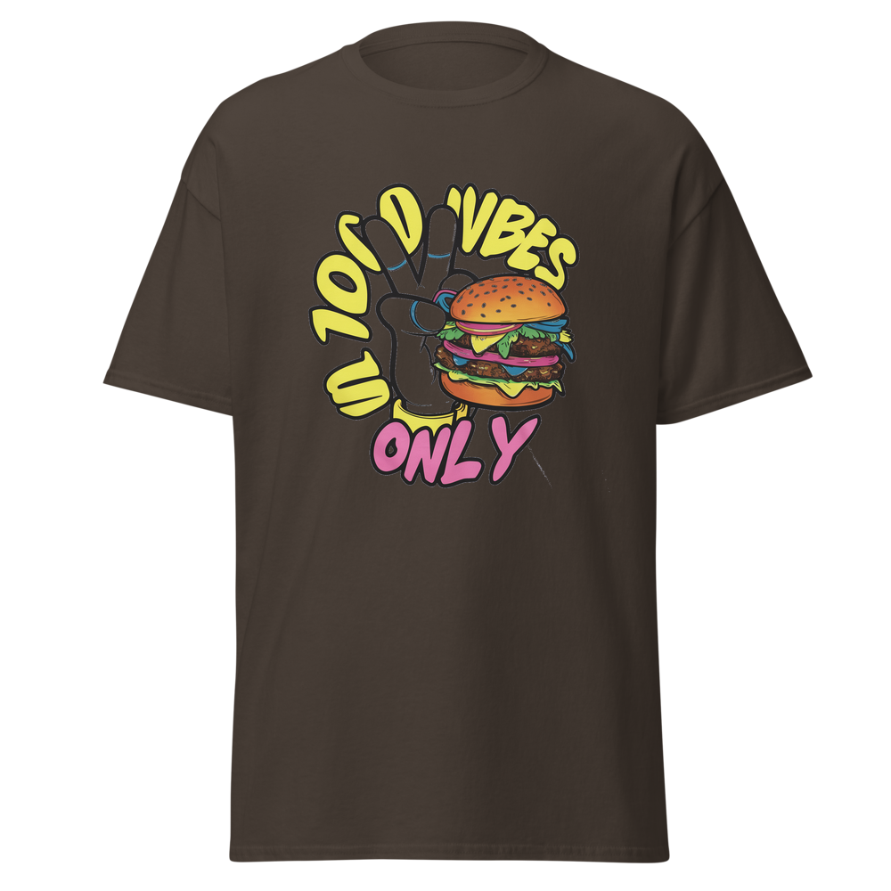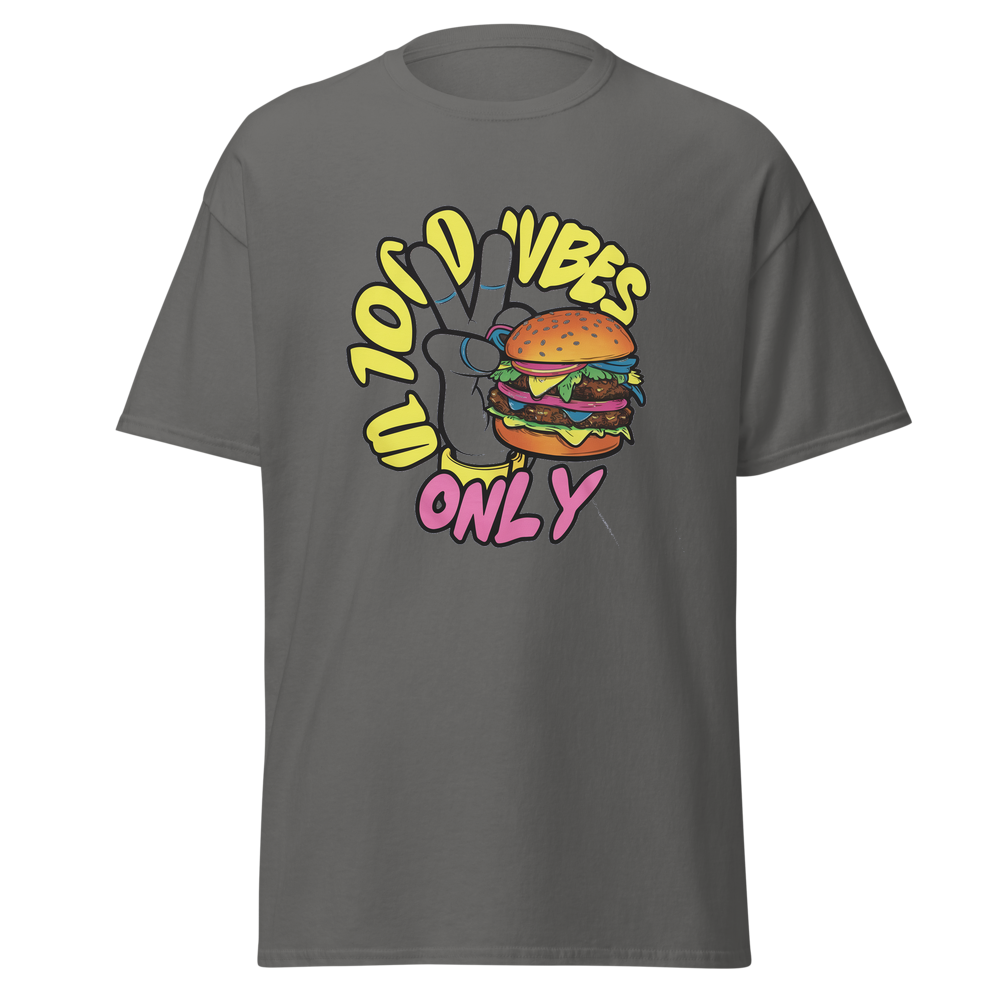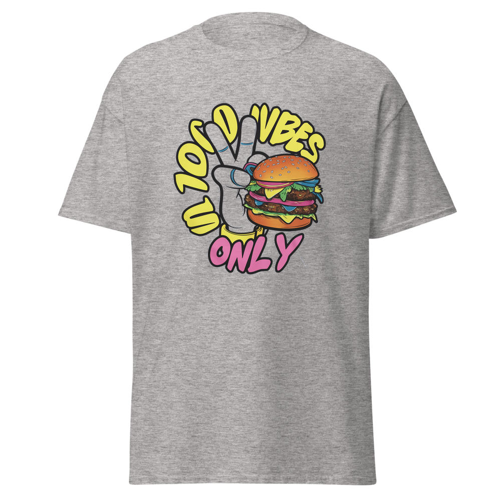 Step into the 90s with this fun and nostalgic t-shirt. It features a unique graphic design that combines a cartoon peace sign hand holding a burger with classic neon patterns. Ideal for food lovers and those who adore retro style, it offers comfort and style in one.