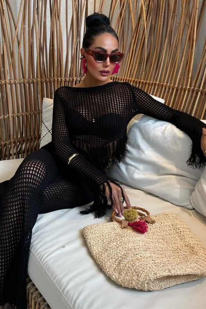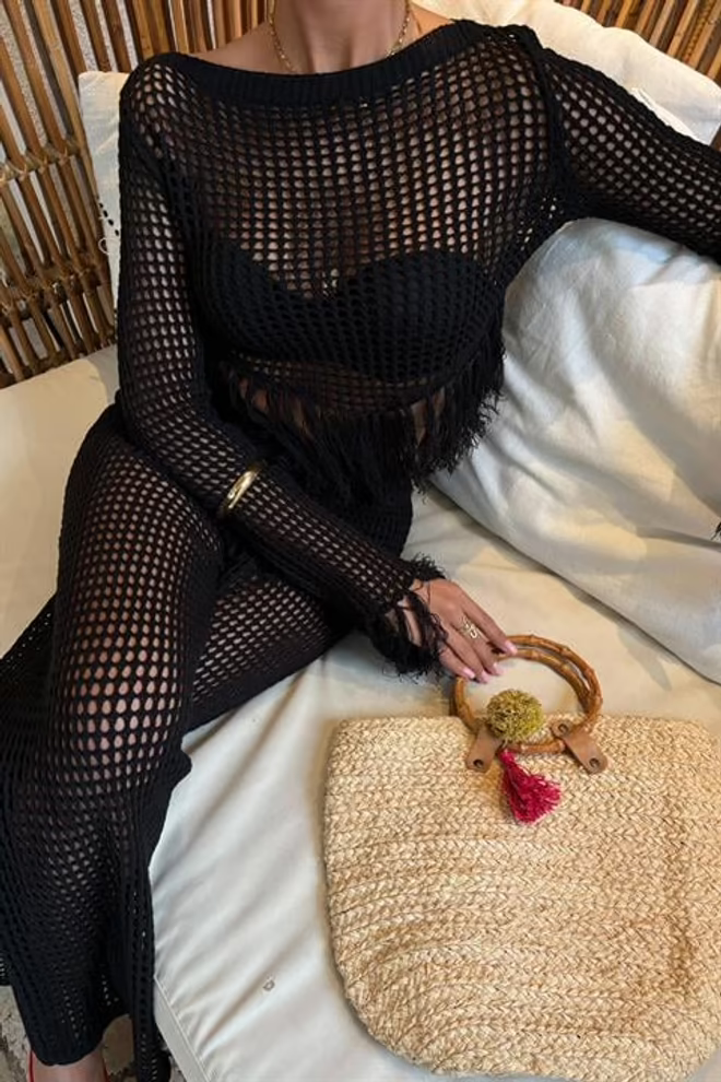 Step into the summer with this stunning black cropped dress. Crafted from a lightweight, open-knit material, it features a unique net-like texture and playful fringe details. The bateau neck and long sleeves with fringed cuffs add a touch of bohemian charm, making it perfect for beach outings and summer festivals.