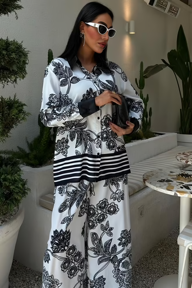 - Fabric characteristics: Made from a smooth, satin-like fabric (silk or silk-blend) or high-quality crepe with a subtle sheen. It has a structured yet drapey appearance, holding the wide-leg shape while flowing naturally.