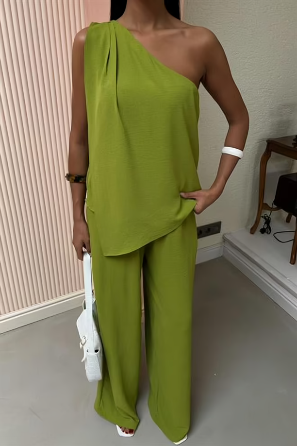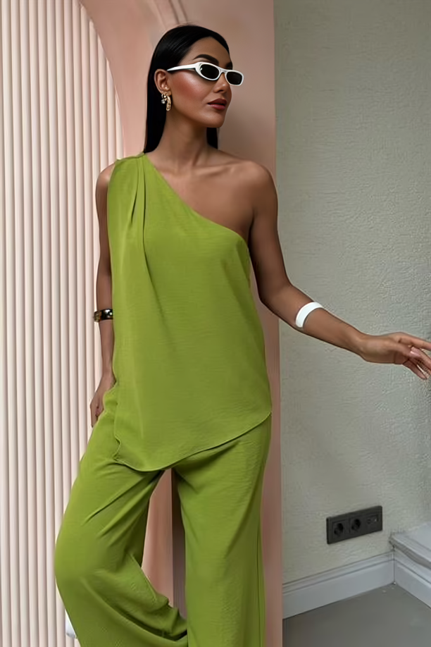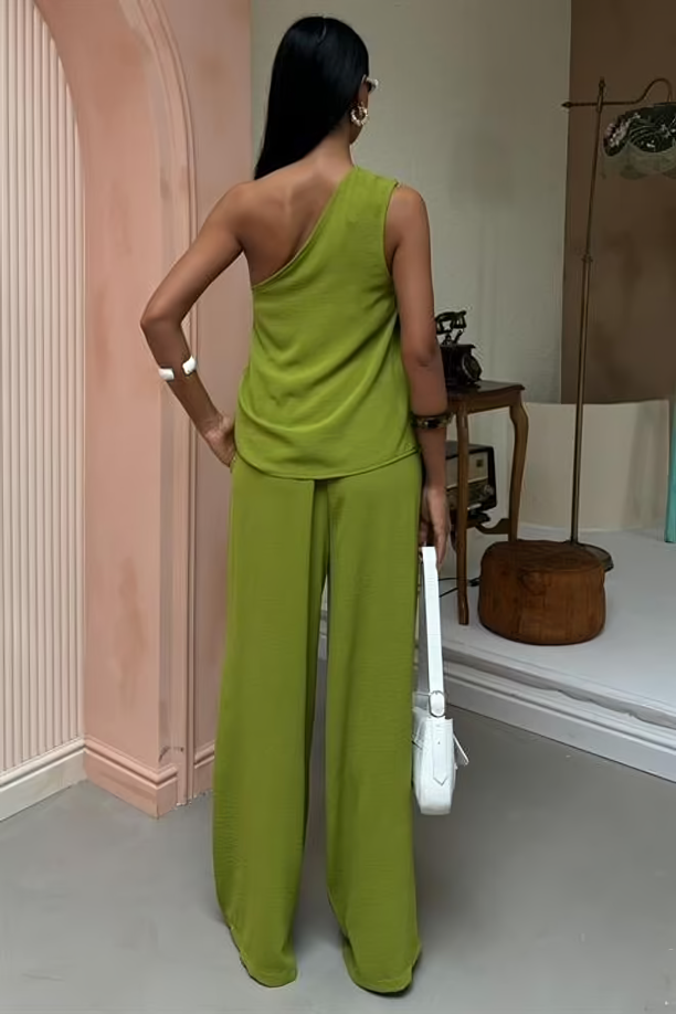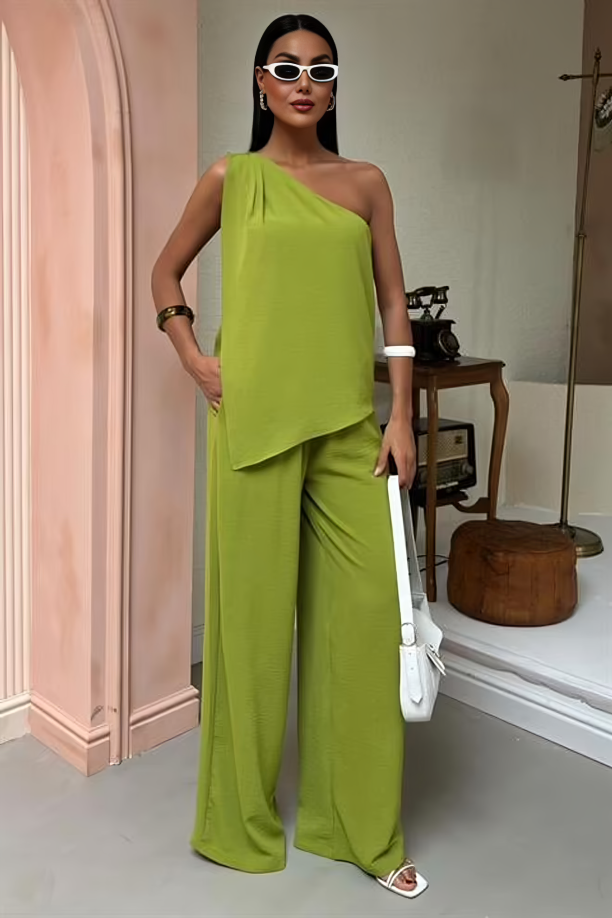 Experience the perfect blend of modern elegance and retro charm with this bright green maxi dress. Crafted from a smooth, satin-like fabric with a subtle sheen, it features an asymmetric one-shoulder design that adds a contemporary edge to its sophisticated look. The high-waisted wide-leg pants silhouette creates a relaxed yet polished, statuesque appearance.