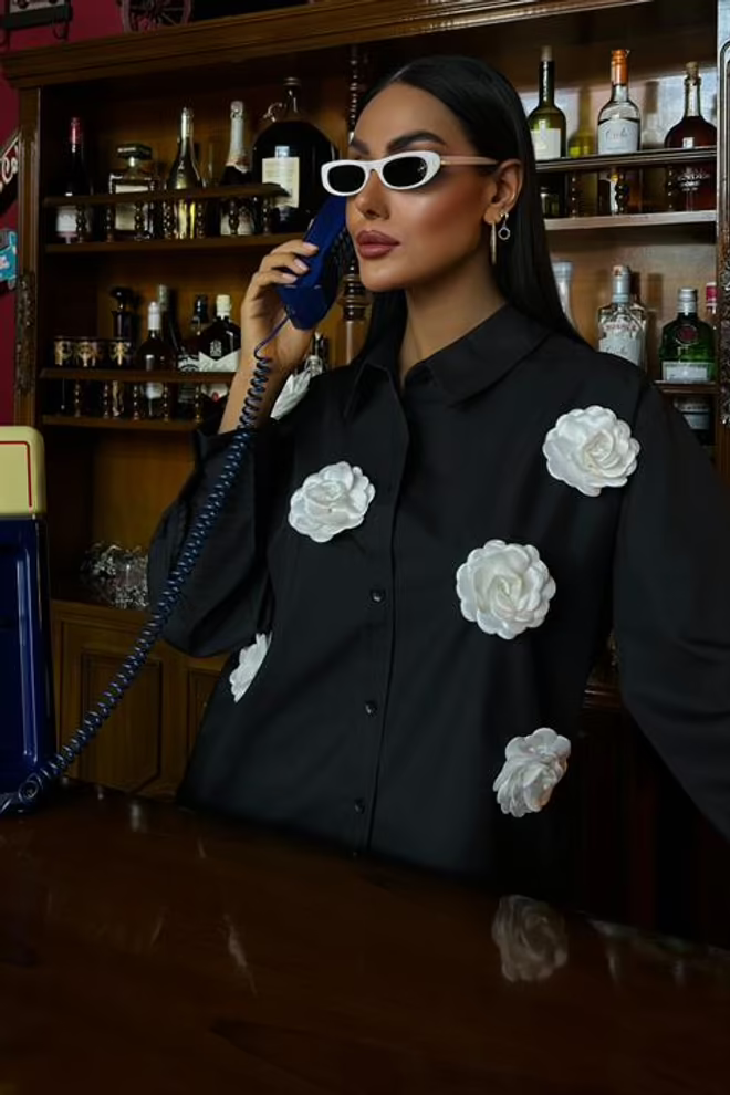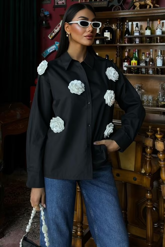 This black oversized button-up shirt combines classic style with modern flair. The solid black base is adorned with white 3D rose-shaped appliqués, creating a bold and romantic look. Its oversized fit and structured silhouette make it a versatile piece for various occasions.