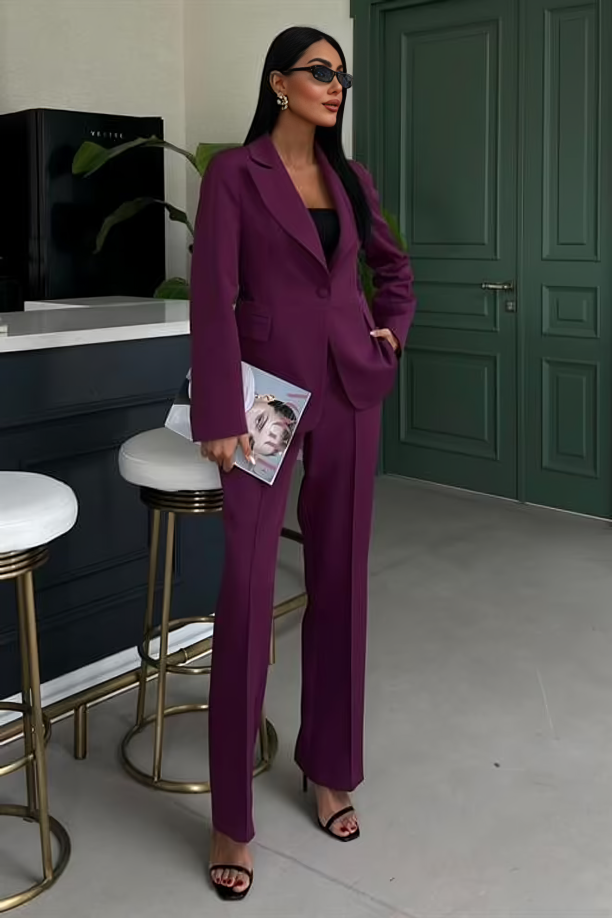 This power suit in a rich, saturated plum/magenta hue offers a sophisticated and modern look. With its solid color and tailored silhouette, it exudes confidence and elegance, perfect for formal and professional settings.