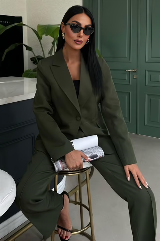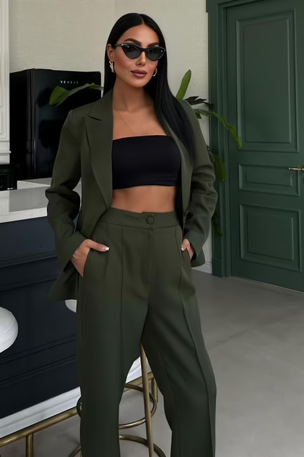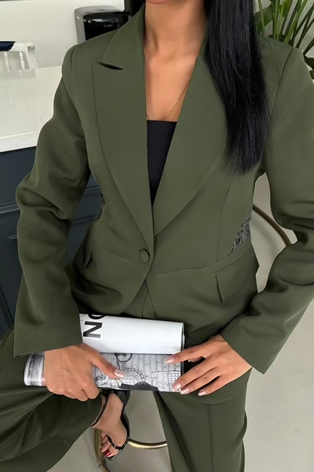 - Color & Pattern: Solid olive green for the blazer and trousers, with a dark floral lace panel on the blazer back.