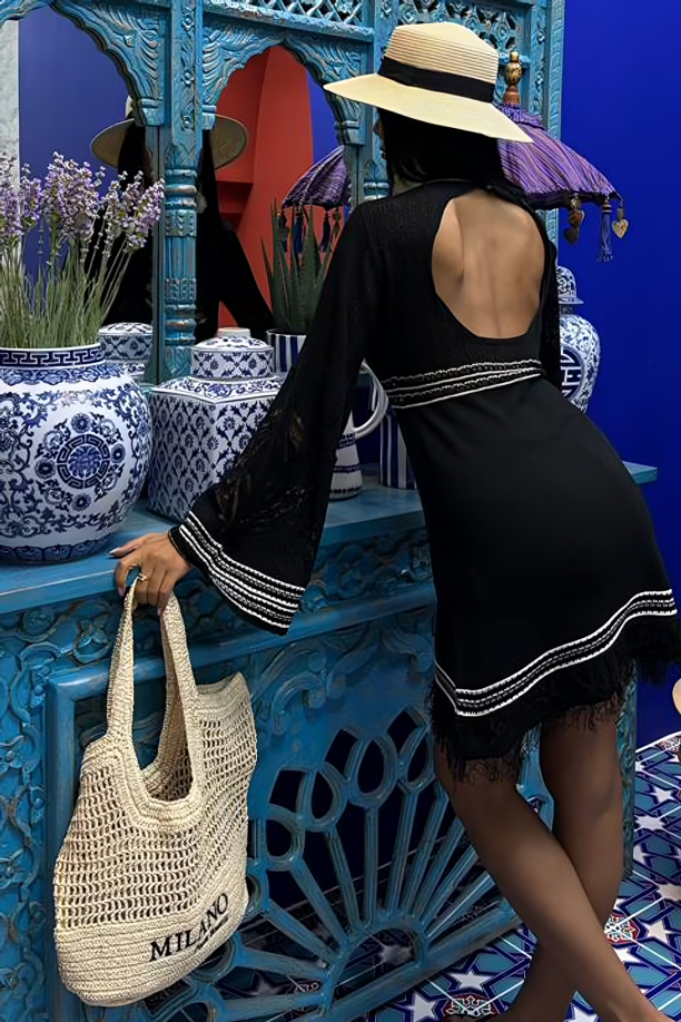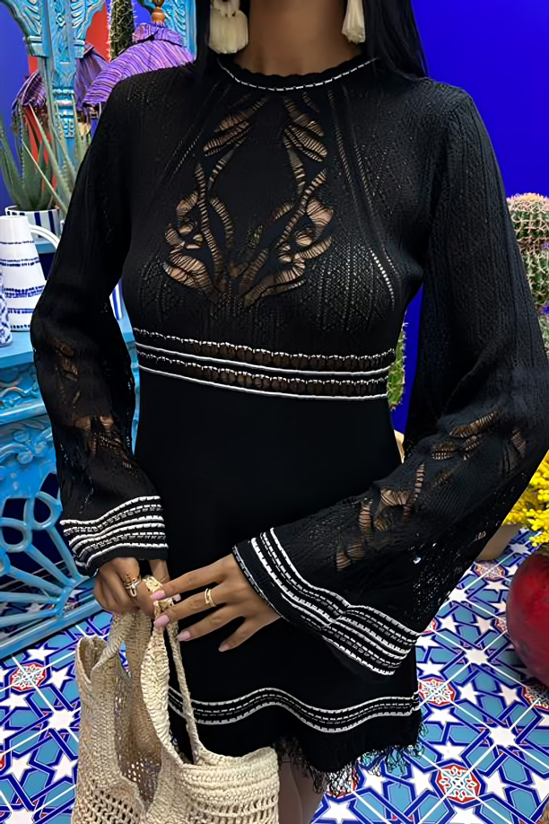 Introducing a stunning bohemian mini dress in a solid black base, accentuated with white decorative trim and delicate lace detailing. The intricate geometric lace cut – out at the chest and the long bell sleeves with flared cuffs add a touch of elegance and femininity, making it perfect for casual summer outings.