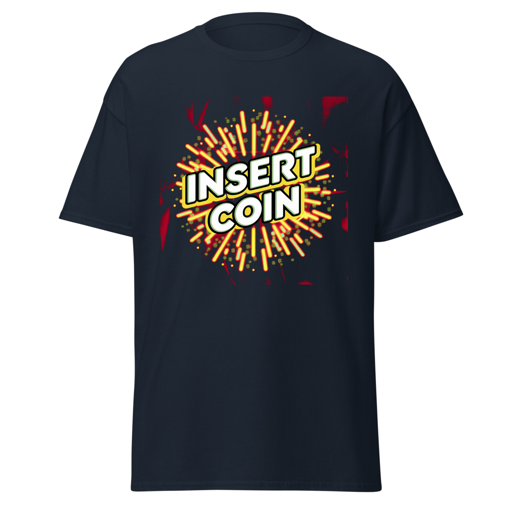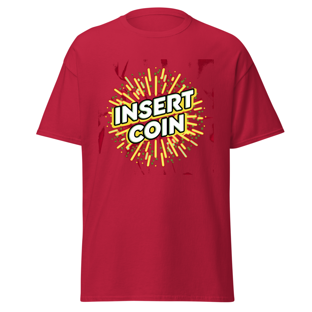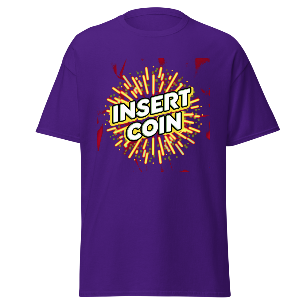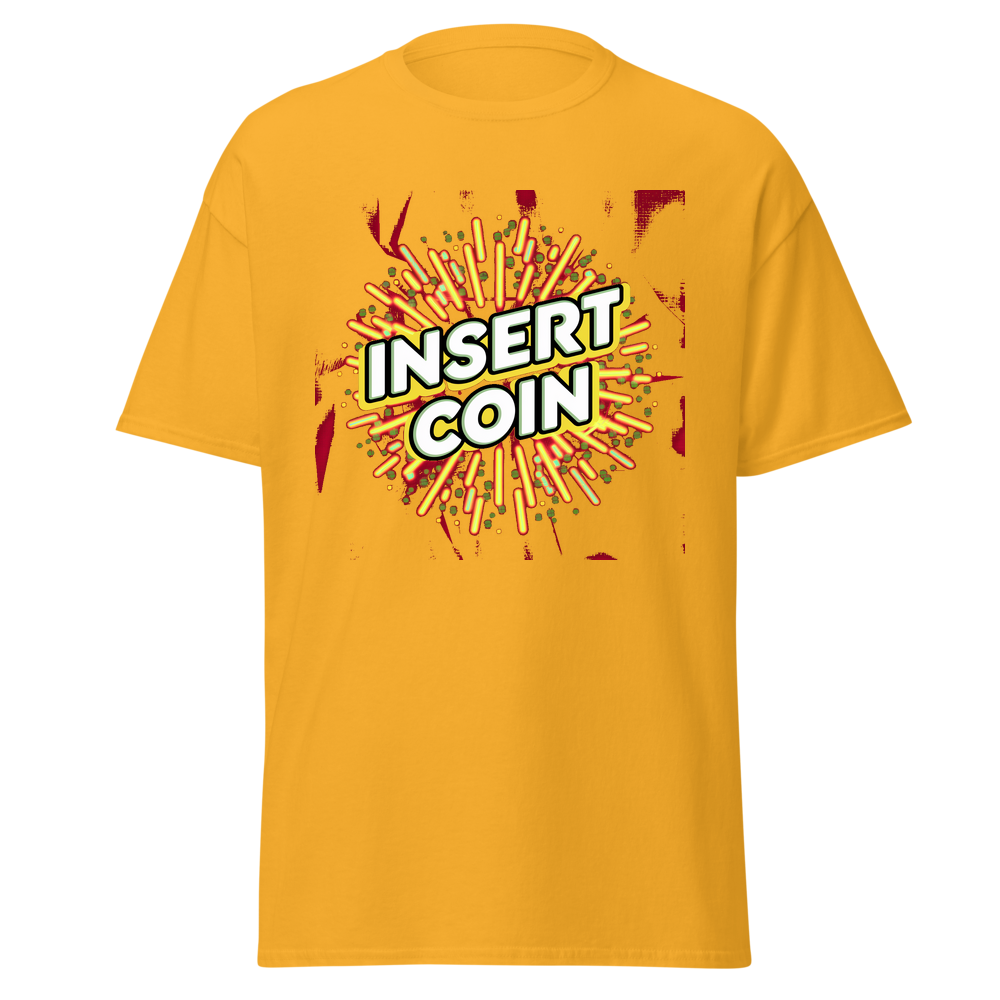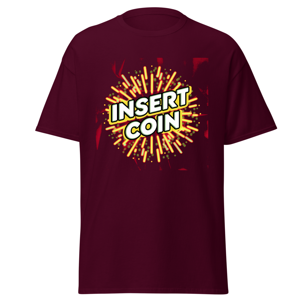 - Design: Cool retro “Insert Coin” design with arcade – style borders and fun abstract patterns