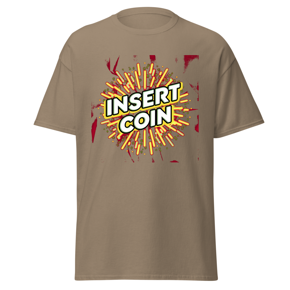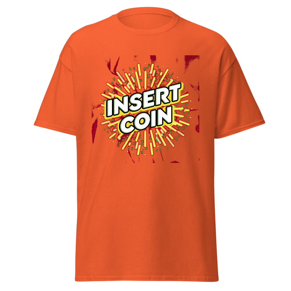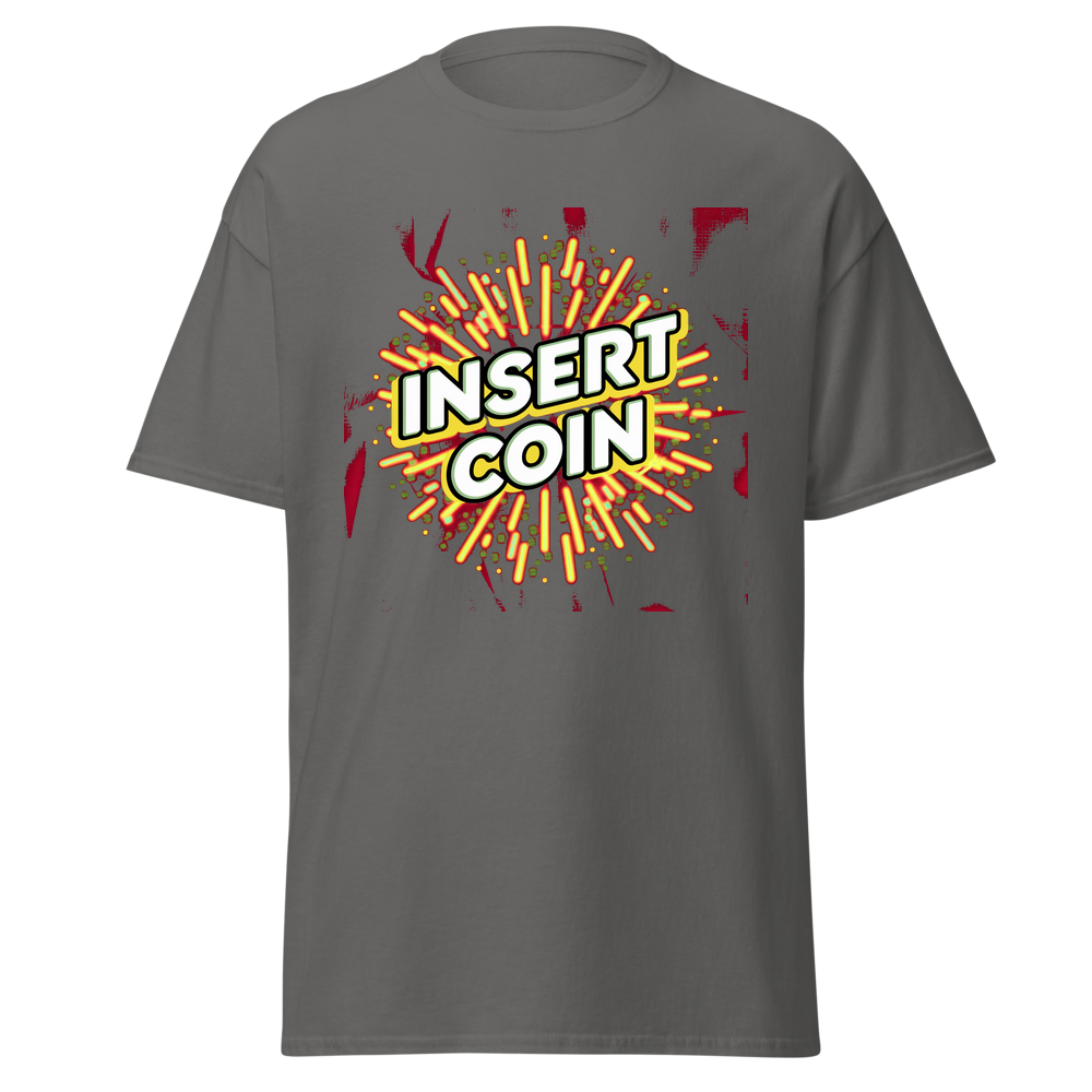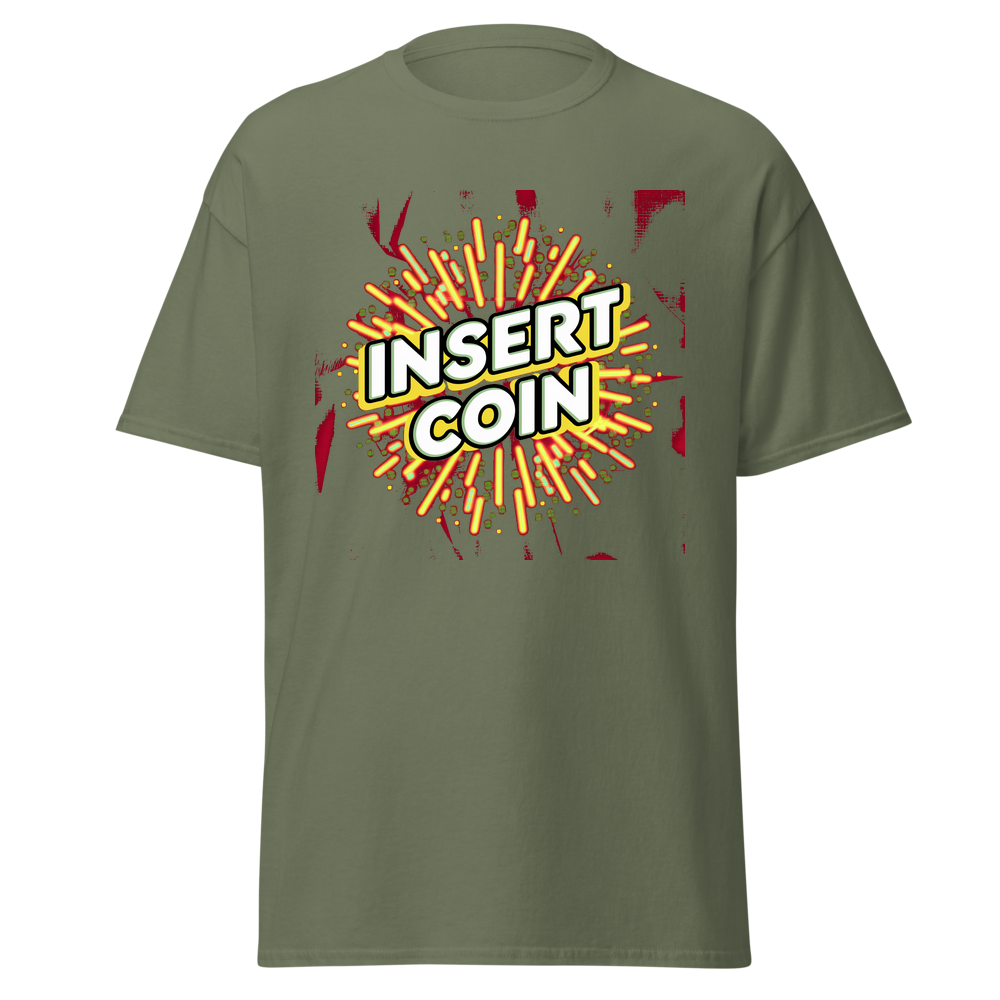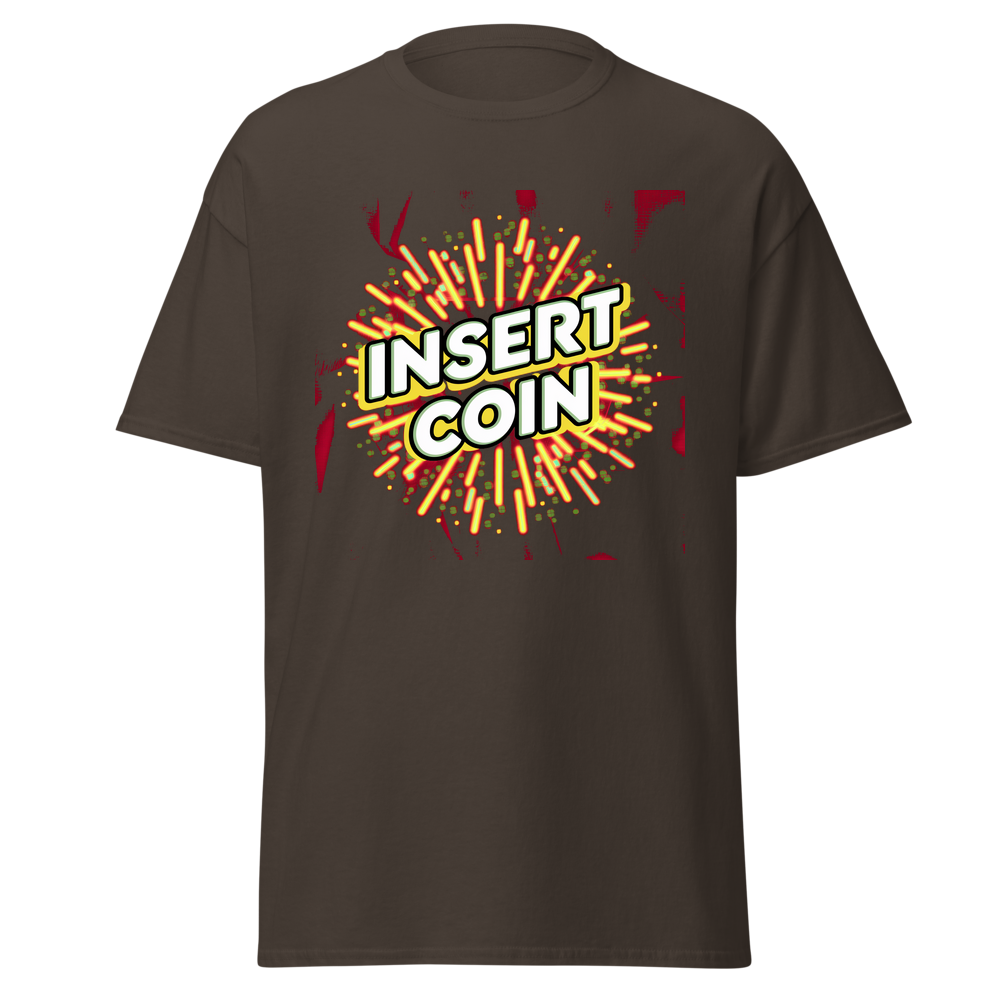 - Design: Cool retro “Insert Coin” design with arcade – style borders and fun abstract patterns