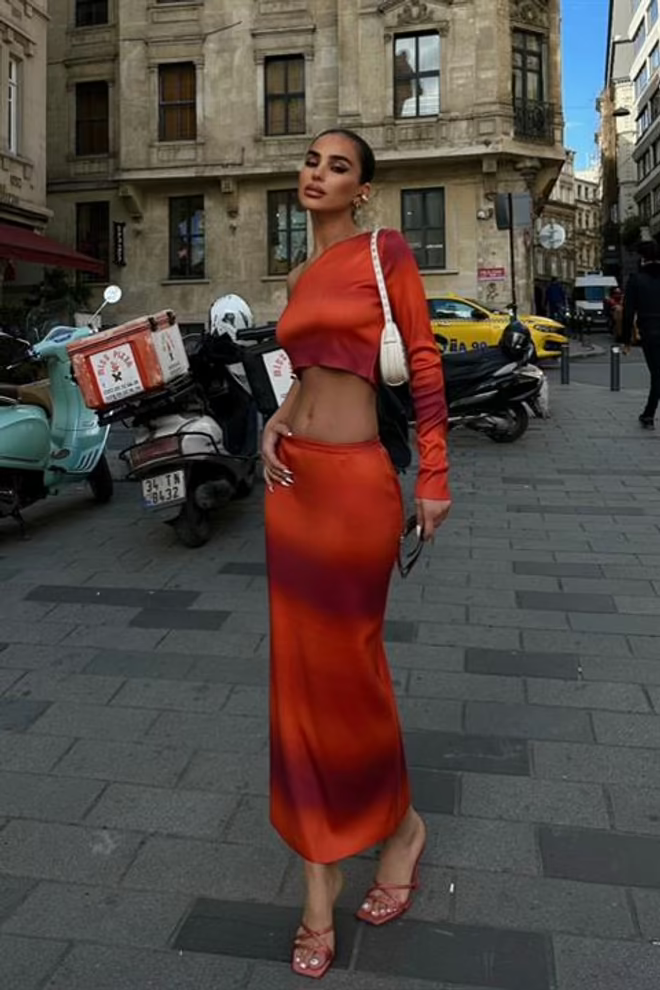 - Color & Pattern: Ombré pattern with a gradient from orange at the top to red/purple at the skirt’s hem.