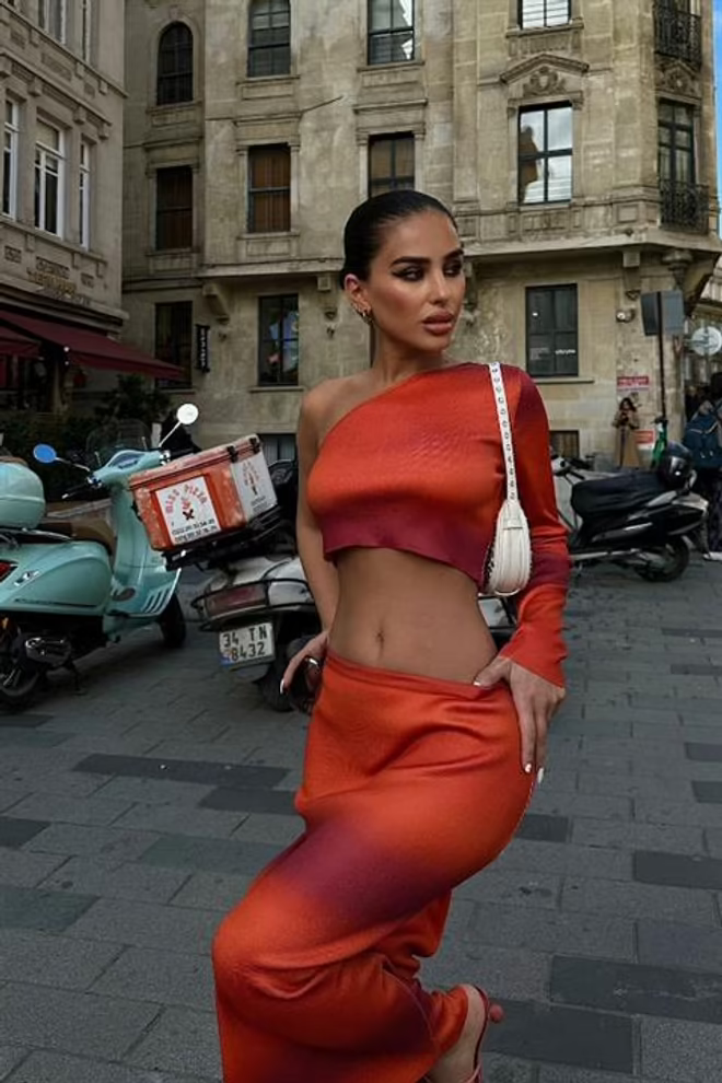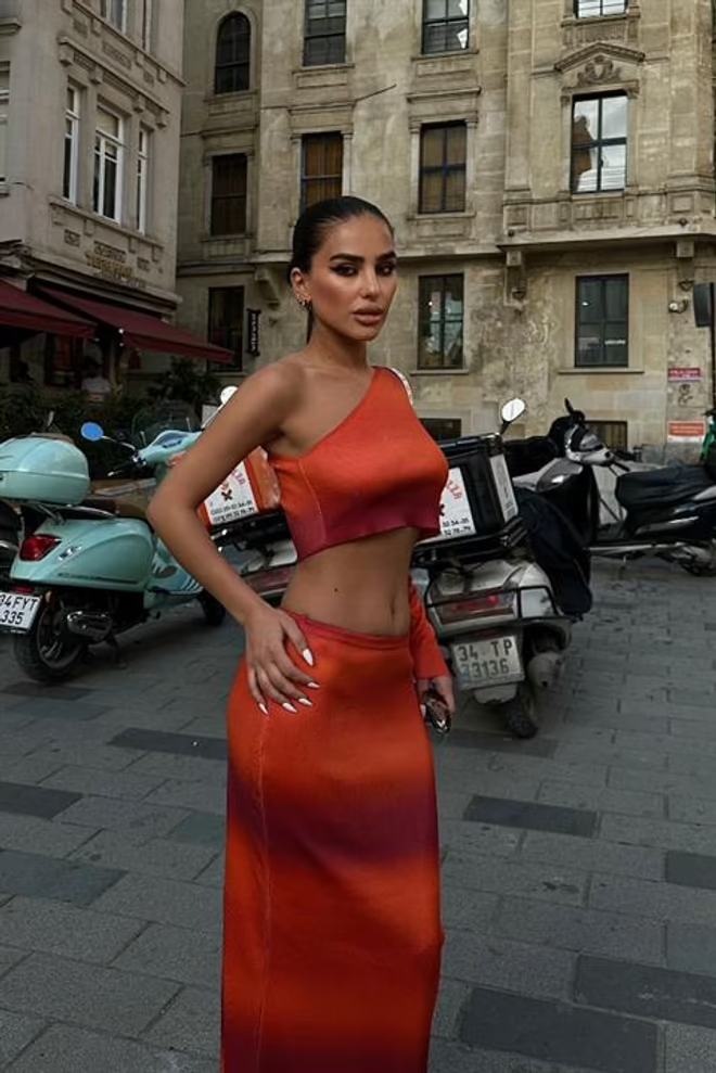Make a bold statement with this stunning midi dress. It features an eye – catching ombré gradient that transitions from bright orange at the top to a deeper red/purple at the skirt’s hem. The one – shoulder design and sleek satin – like fabric add a touch of glamour and sophistication.