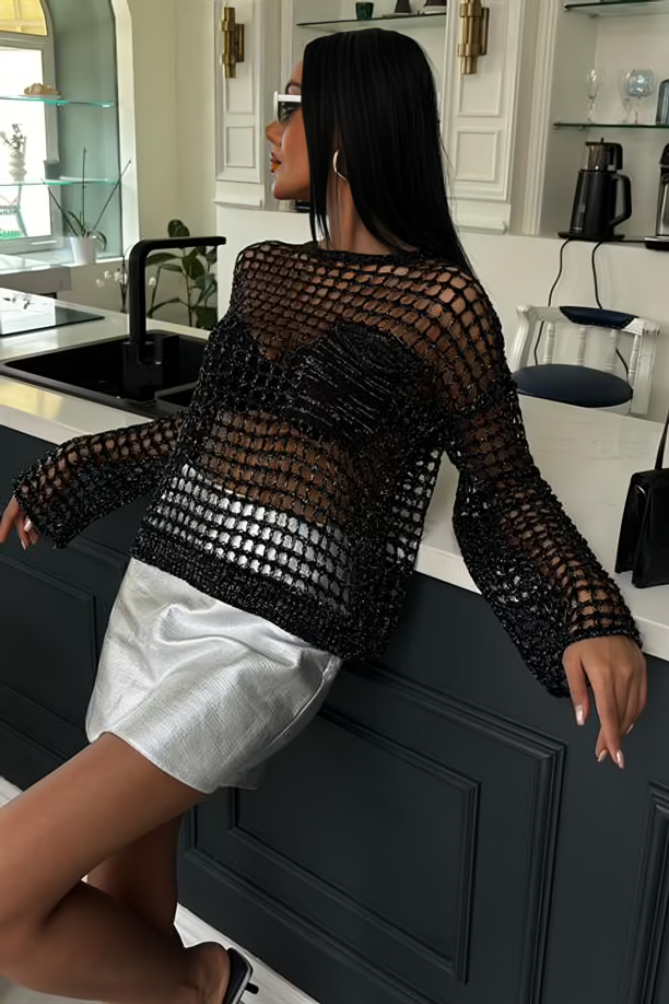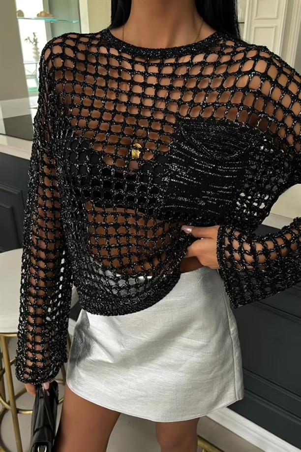 - Design features: Round neckline (crewneck), long, oversized sleeves, straight hemline, and open mesh (knit) construction with no visible hardware.