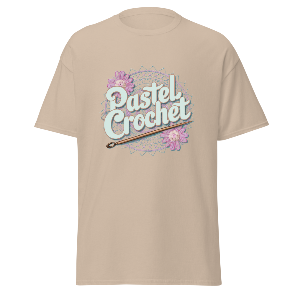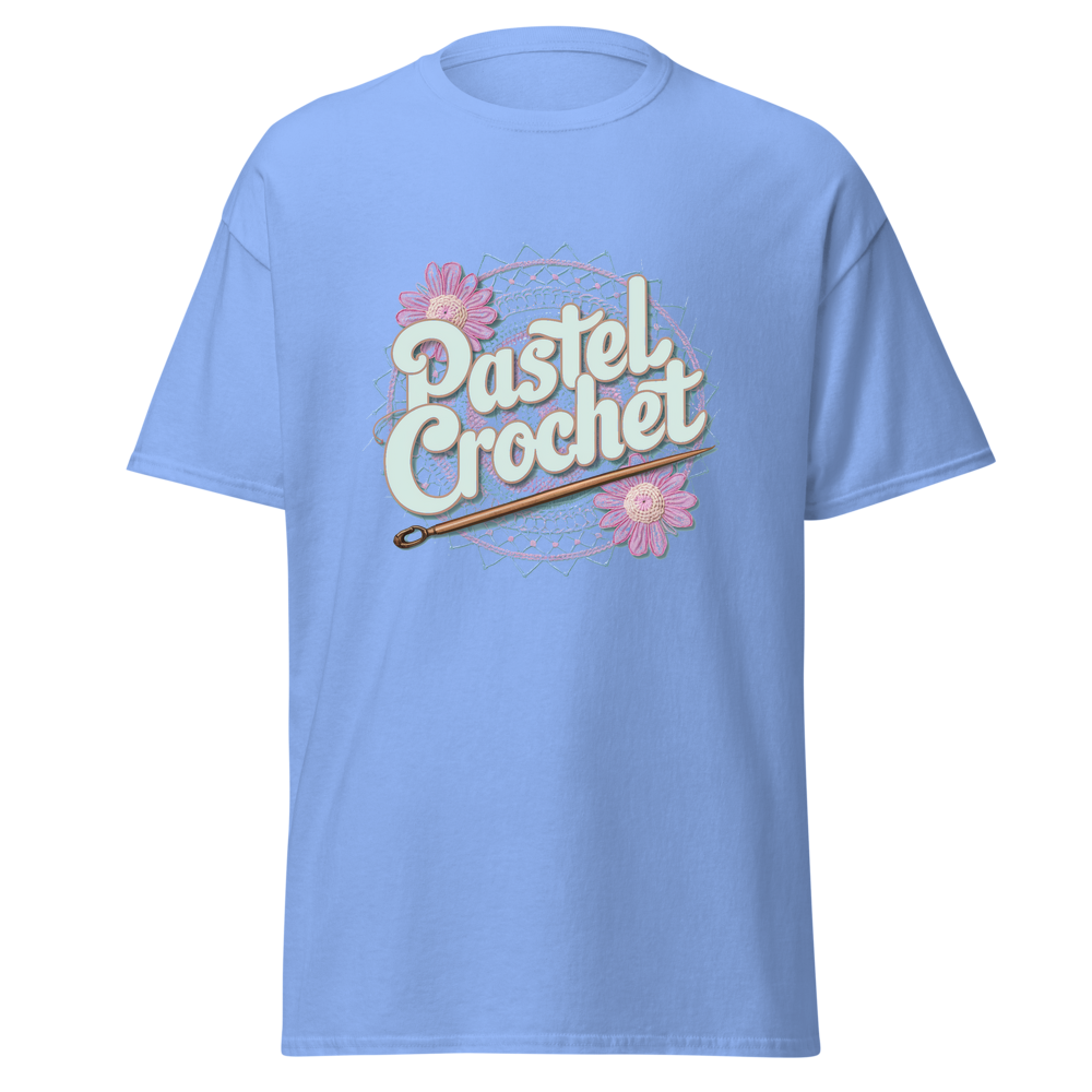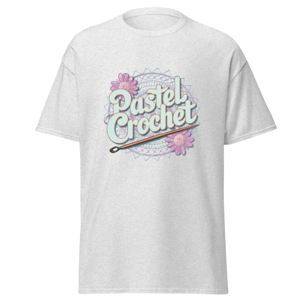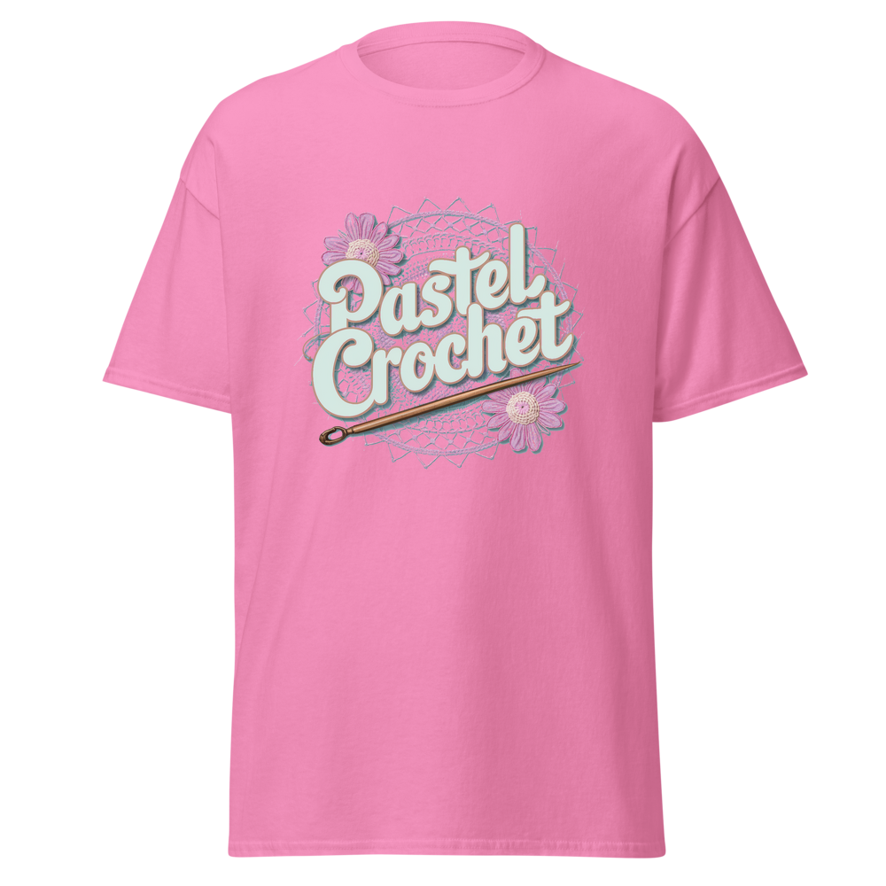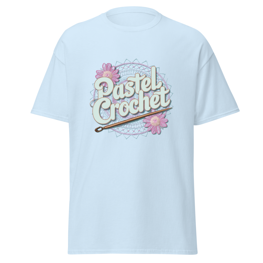 Indulge in the allure of crochet with this unique t-shirt. It combines the charm of traditional crochet with a modern pastel twist, offering a soft and comfortable wear. Ideal for those who love crafts and casual fashion.
