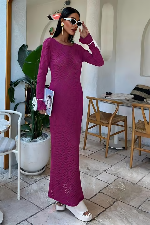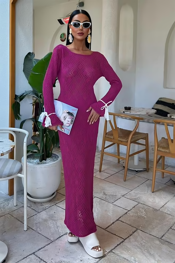 This maxi dress is a stunning piece in vibrant magenta, featuring a textured geometric diamond knit pattern. The delicate white tasseled straps at the back and cuffs add a playful and glamorous touch, making it perfect for a bohemian – resort style.