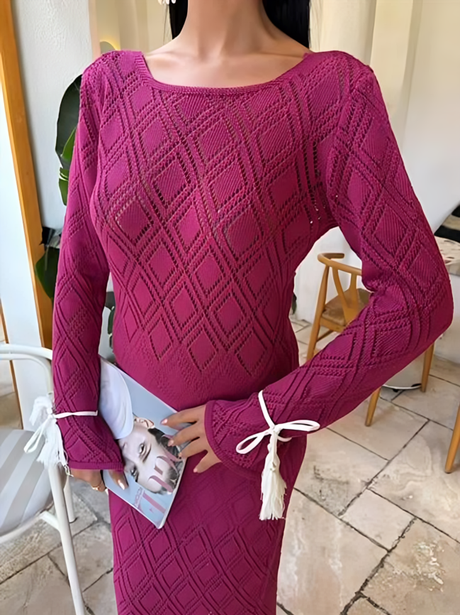 - Design features: The back has an open V/keyhole neckline secured by white tasseled straps tied in a bow. It has long sleeves with white tassel accents at the cuffs and a straight hemline. There are also geometric diamond knit patterns throughout the dress.