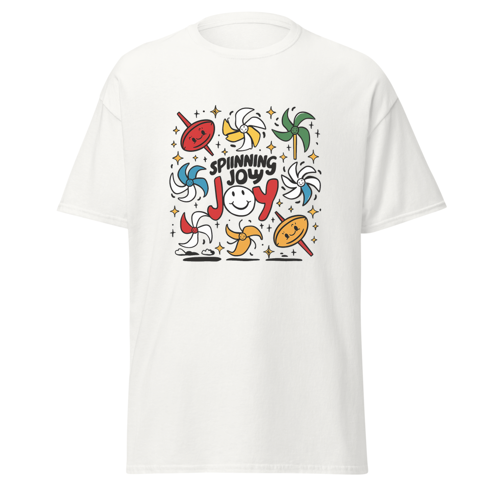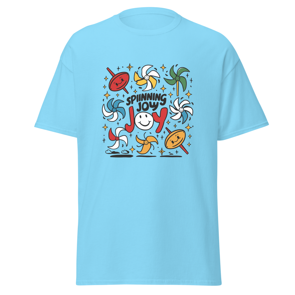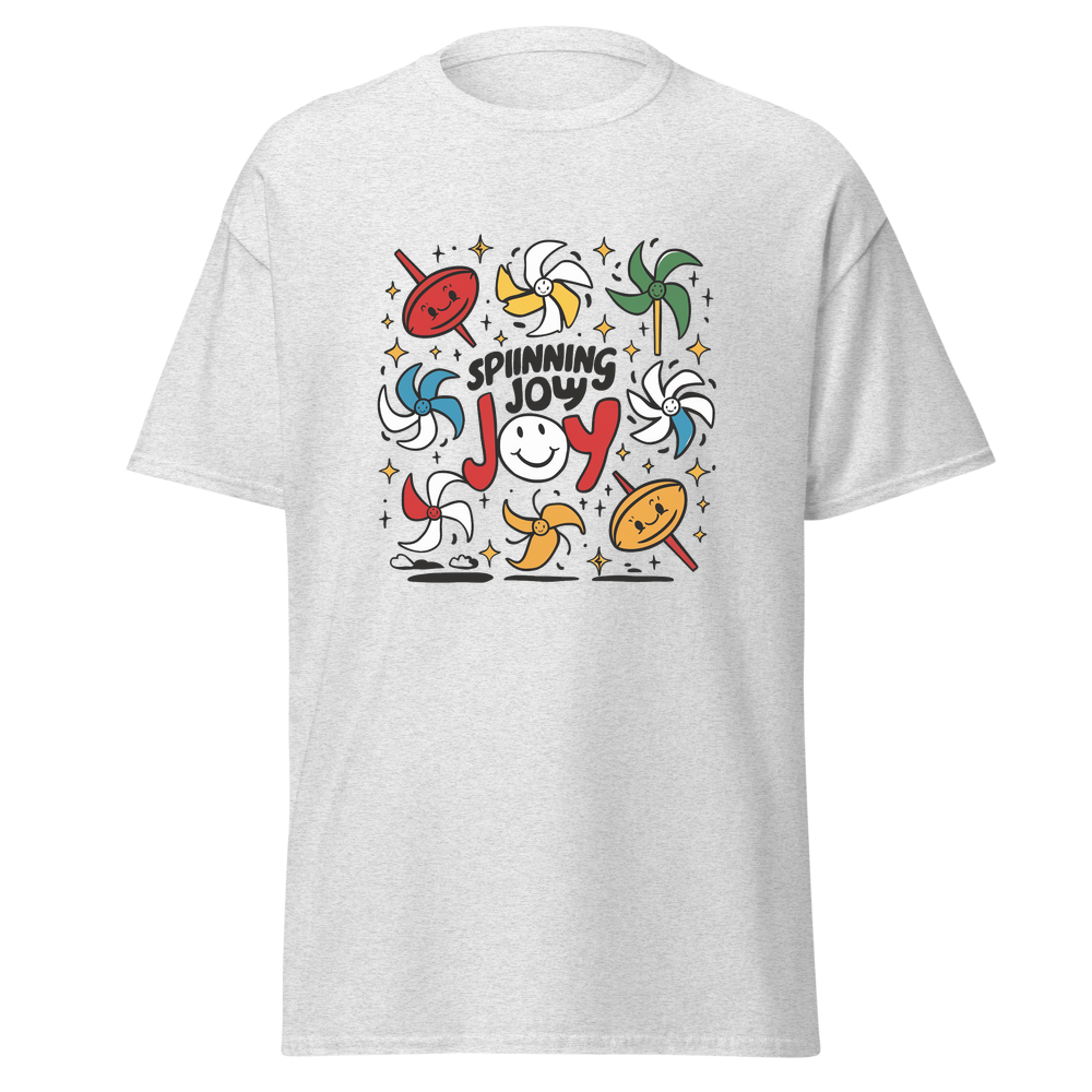 Indulge in the nostalgia of classic toys with this charming t-shirt. Featuring a delightful graphic of spinning tops and pinwheels, it’s perfect for kids and those with a youthful spirit. The soft and lightweight fabric offers comfort and a flattering fit for everyone.